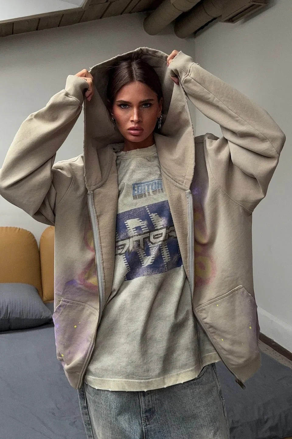 Vintage Street Style Zip Up Hoodie - BLACK CARTA